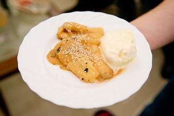 — Теперь наступила очередь десерта: жареных бананов в кокосовой карамели. На две порции нам понадобятся два банана, 1 столовая ложка сливочного масла, 3–4 столовых ложки сахарного сиропа, 4 столовых лодки кокосовых сливок или молока, а также сок половинки лайма и два шарика мороженого. Обжариваем ломтики банана в масле до золотистого цвета на медленном огне, увеличиваем температуру жарки и добавляем сироп, молоко и сок лайма. Обжариваем до карамелизации. Выкладываем на тарелку, подаем к столу с шариком мороженого, при подаче посыпаем блюдо кунжутом.