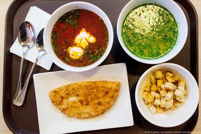 Что касается основного меню, то оно, на первый взгляд, не претерпело особых изменений: есть очень недорогие блюда (классика жанра — это диетический куриный бульон с половинкой вареного яйца), для тех, кто рангом повыше — наваристый борщ (к любому супу можно взять хрустящих свежих сухариков из белого хлеба). Ну и далее по списку: салат витаминный, свекольный, оливье, на второе — плов, котлеты. На завтрак дают яичницу и сырники. Из напитков — кефир, соки, чай, кофе. Добавилась домашняя выпечка, но над ней поварам еще нужно работать: суховата начинка, немного тягучее тесто. Завтрак стоит 95 рублей, сытно пообедать можно в пределах ста пятидесяти — по нынешним меркам это более чем бюджетно.