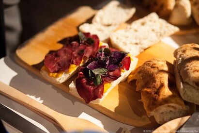 Ингредиенты: 1 небольшая тыковка, 4–5 болгарских перцев (лучше красных), мясо по вашему выбору (мы брали прошутто из говядины — сырокопчёное мясо, нарезанное тонкими ломтиками, а также копчёную свиную грудинку), свежий зелёный базилик, немного оливкового масла и соли (морской либо ароматизированной).