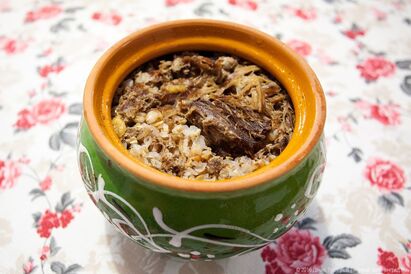 Всего около десяти наименований, с мясом и без: есть пшенная или перловая со свининой (каждая по сто рублей), а есть пшеничная с курагой и с тыквой (70 рублей за горшок) и кукурузная с черносливом за такую же цену. Мы заказали по одному «мясному» горшку: с перловкой и гречкой. И в том и другом случае каши рассыпчатые — перловка так вообще той правильной консистенции, когда лопается во рту. Масло и соль обнаруживаются ближе к середине порции.