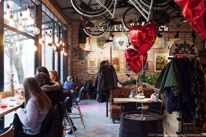 На стенах таблички и вывески. Под потолком — велосипеды дожидаются открытия сезона. На стеллажах выстроились разнокалиберные бутылки (лимонады,