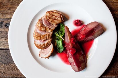 Луковый суп довольно деликатный, не насыщенный, вместо крутона к нему подают две половинки обычного тостового хлеба, на каждой — маленькая горочка расплавленного сыра. Нет, не козьего, кажется, что обычного сливочного. Свиные рёбра принесли на абсолютно ледяной тарелке: возможно, повар решил сыграть на балансе горячего и холодного, а возможно, просто не догадался слегка подогреть. От запечённых ребер все же