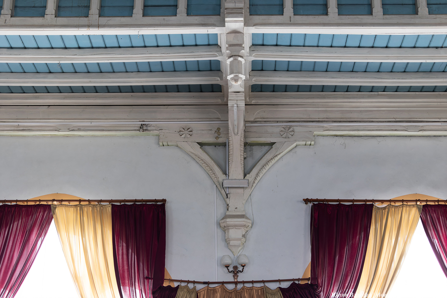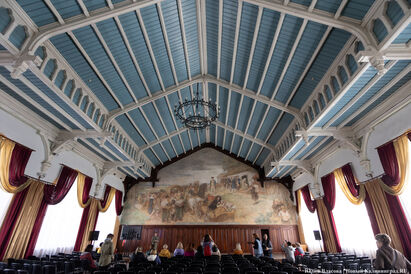 «Реставраторы сняли верхний слой изображения, и поэтому оно нам кажется более размытым и дымчатым. Также изначально потолок и небо на фреске были выкрашены в один тон, что придавало сюжету объем. Позднее окантовку сделала новая школа художников. Люстра в этом зале восстановлена, ее изготовили по старым эскизам и привезли немцы», — добавляет собеседник.