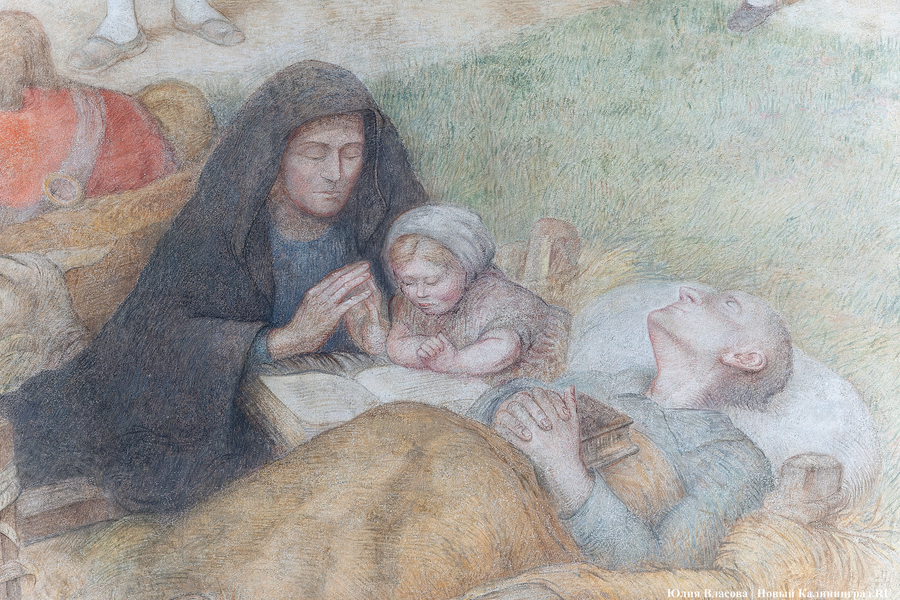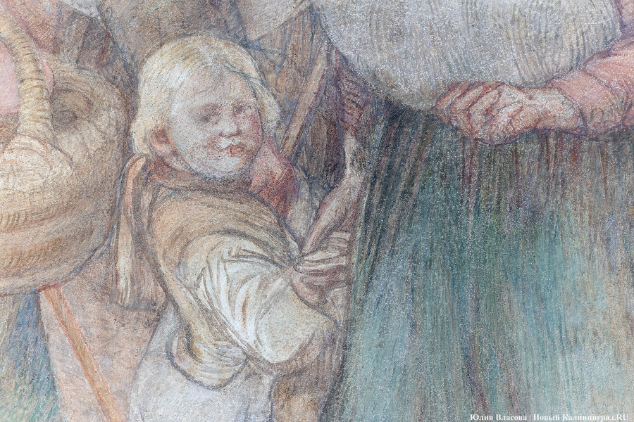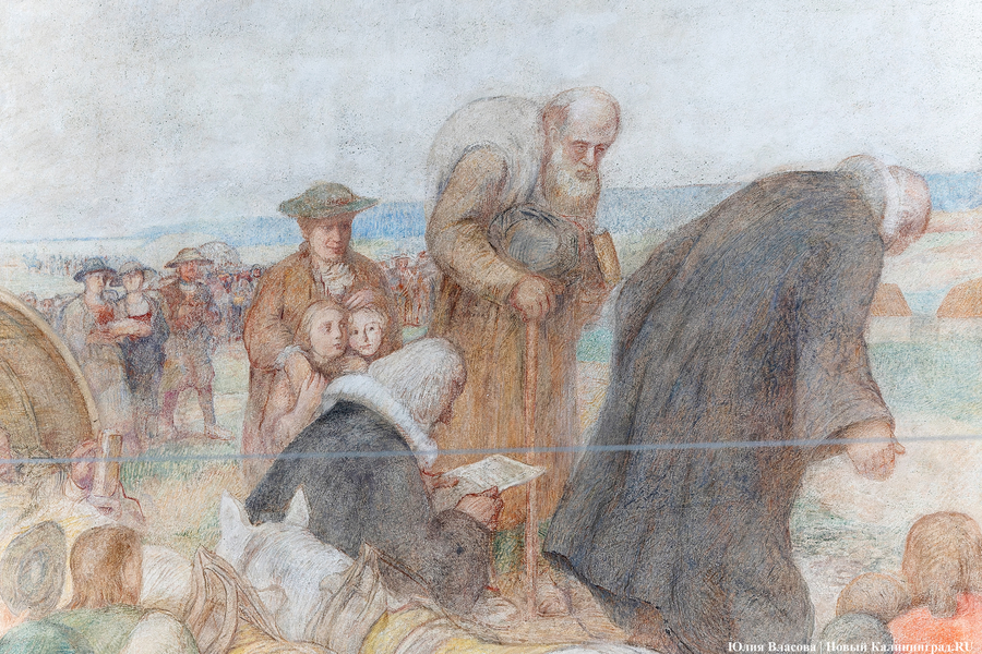 Фреска Отто Хайхерта в гусевском колледже агротехнологий и природообустройства в конце мая этого года отметила 16-летие своей реставрации. Работа площадью 32 квадратных метра, изображающая встречу зальцбургских переселенцев прусским королем Фридрихом-Вильгельмом I, была восстановлена в 2008 году (в советское время ее закрасили меловой краской). Эти работы проводились под руководством реставратора высшей категории Вячеслава Мозгового, прибывшего из Государственного Эрмитажа (под его руководством также восстанавливались горельефы на Королевских воротах). Фреска была создана профессором кенигсбергской Академии художеств Отто Хайхертом в 1913 году. О процессе ее создания и о людях, ставших прототипами короля и окруживших его переселенцев, «Новому Калининграду» рассказала экскурсовод и сотрудница Гусевского историко-краеведческого музея Галина Пелепенко.