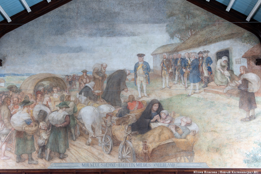 Внизу фрески имеется надпись: «Мне новые сыновья — вам милосердная родина». Эти слова приписывают королю Фридриху Вильгельму I. История с массовым переселением жителей в Гумбиннен (будущий Гусев) повторится уже в августе 1946 года, когда из Брянской области на здешний вокзал прибудет первый эшелон с советскими переселенцами.