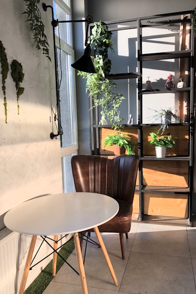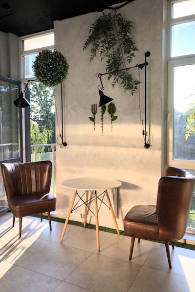 Заведение выделяют необычный интерьер, выполненный с использованием натуральных материалов, камерная атмосфера с приглушённым светом и красивый вид на Нижнее озеро. По желанию гостя персонал проводит «экскурсию по меню». График работы в пятницу и субботу — с 12 до 2 часов, в остальные дни — с 12 до 1. Можно заказать доставку.