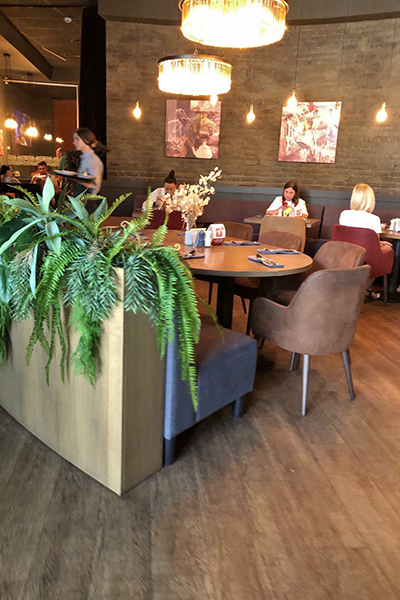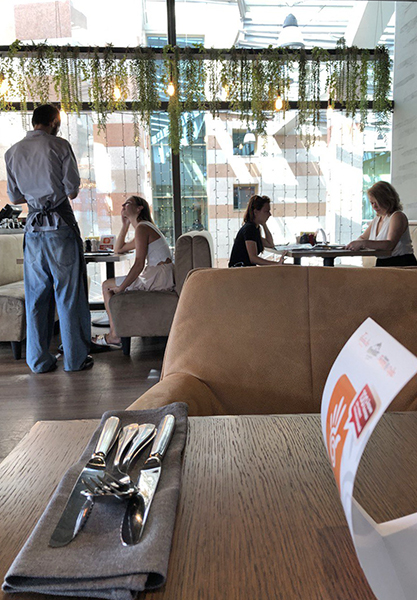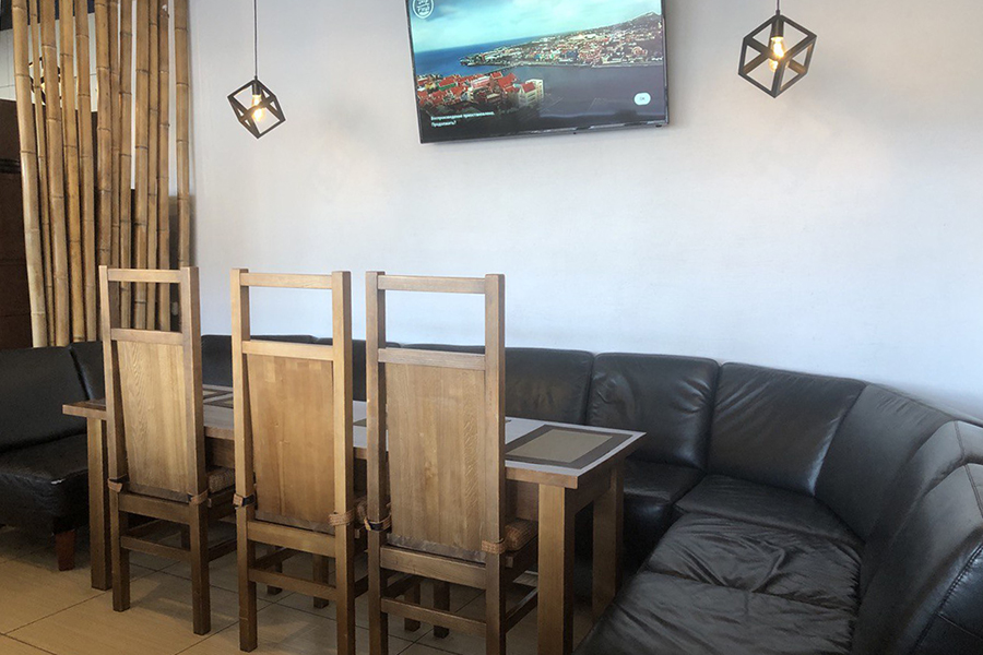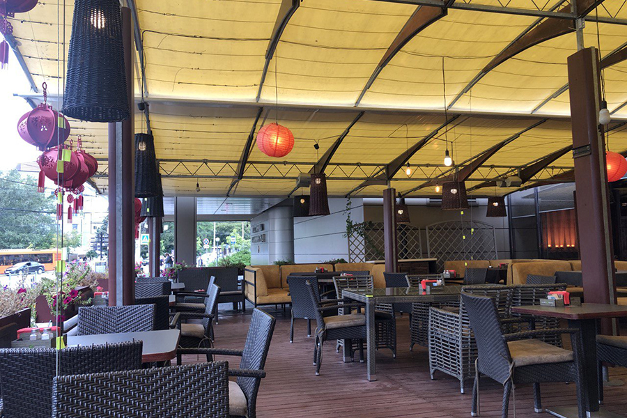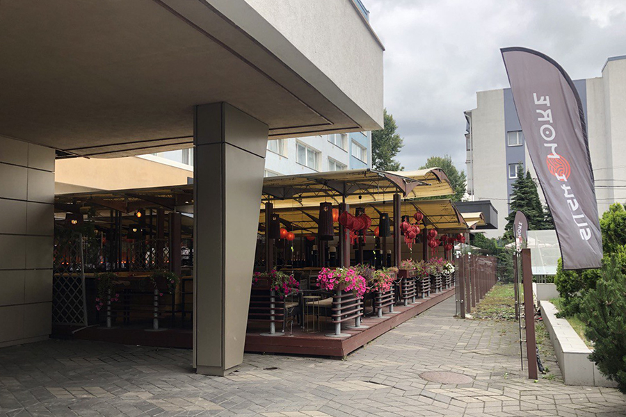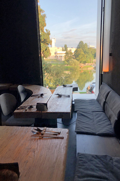 У ресторана приятный интерьер с видом на Верхнее озеро. Он открыт ежедневно с 12 до 23 часов. Работает доставка.