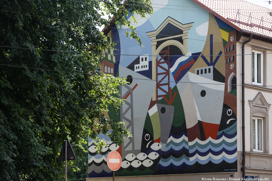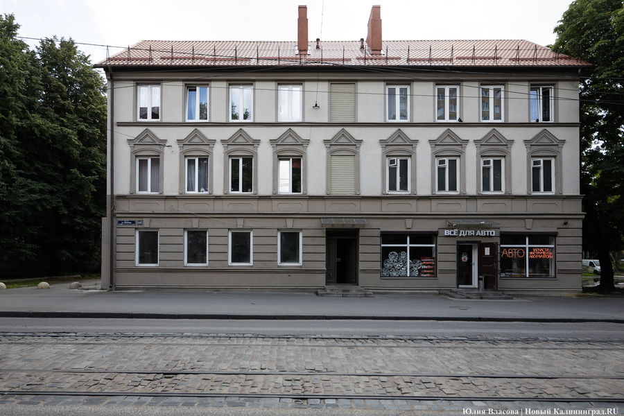 С Октябрьской площади по маленьким улочкам Осиновой (бывшая Эшенвег) и Фабричной (прежде — Праппельнер-штрассе) опять выходим на Киевскую и движемся через железнодорожный мост к дому № 137. Эта немецкая трехэтажка хранит одну удивительную тайну: на одной из её стен — мозаика на морскую тему. Её совсем недавно изготовил и установил мастер из Зеленоградска Павел Савельев по заказу регионального Фонда капремонта.