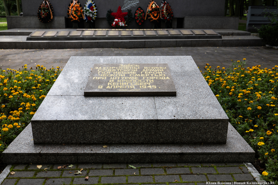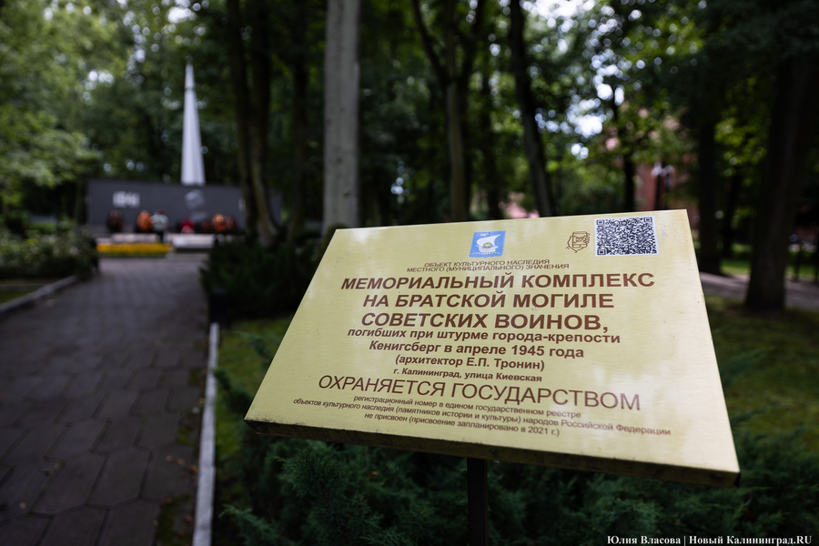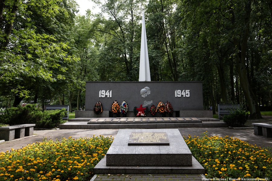 Братская могила рядом с современным кинотеатром «Киноленд» появилась в ходе штурма Кёнигсберга. В 1952 году на её месте был установлен скромный памятник. В 1971-м его заменил мемориальный комплекс, построенный по проекту архитектора Евгения Тронина.