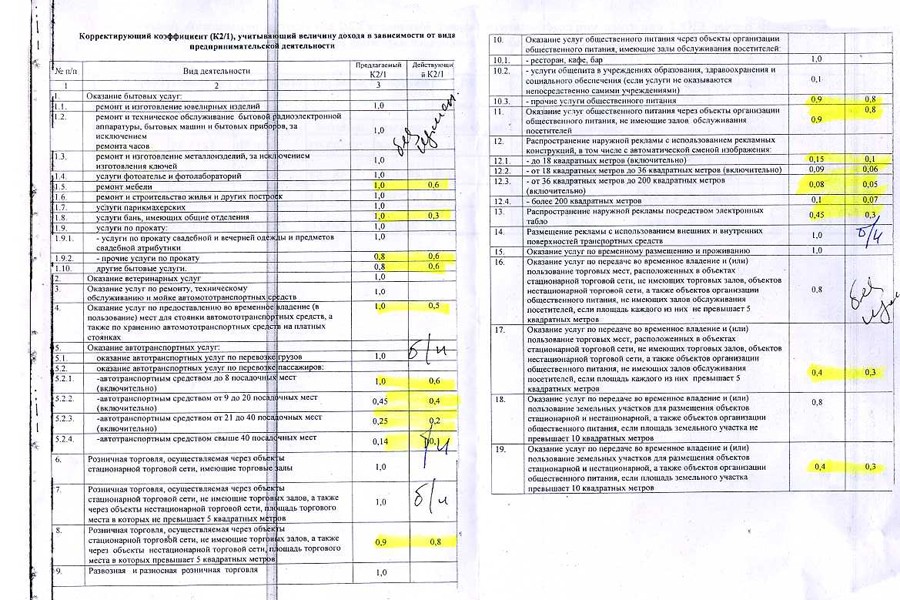 Горвласти предложили повысить коэффициент «вмененки» почти для всех видов предпринимательства за небольшим исключением (см. таблицу). Кроме того, в ходе заседания комиссии депутат Сергей Донских обратился к коллегам от имени саморегулируемой транспортной организации с просьбой не повышать налог для больших автобусов свыше 40 посадочных мест. Глава комиссии Олег Мигунов, в свою очередь, обратился с просьбой не повышать ставки для рекламщиков. «Есть инвестиционные планы по замене старых вывесок на новые, кроме того, в городе сейчас большой объем социальной рекламы, она занимает около 30% площадей, а не 5%, как это прописано в законодательстве, рекламщики несут большую социальную нагрузку», — обосновал свою просьбу Мигунов. Депутаты решили коллег поддержать.