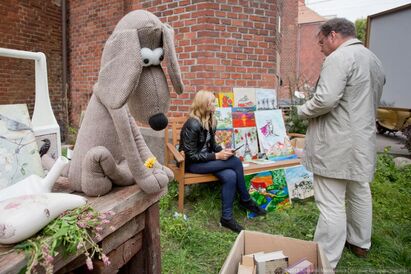 За несколько часов на столах и паллетах появляются аккуратно разложенные вещи: немецкие тарелки и стаканы, соломенные шляпы, очки, видеокассеты, пластинки, книги, фотографии, картины, джембе, детские игрушки, обувь и много разной одежды. В саду становится тесно.