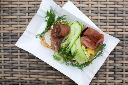 За салаку на празднике отвечает только одна точка — это балтийское арт-кафе «Клер», кажется, что это единственные участники, которые позаботились о тематическом соответствии своей продукции теме праздника и приготовили вполне рыбные и весенние блюда. Например, салат из черемши, яиц и зеленого лука подавали они на жареной салаке, салаку пряного посола — на ломтиках чиабатты в прованских травах, для любителей «уличной еды» — разогревали свою версию фиш-бургера, для любителей классических рыбных блюд сделали селедку под шубой. Да, шашлыки у «Клер» тоже были, но не сказать, что в приоритете.