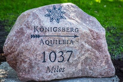 Еще один непременный атрибут знаковых мест «Янтарного пути» — камень с логотипом проекта и цифрами, указывающими расстояние до порта Аквилеи. Ведь, как известно, исторический торговый маршрут пролегал от земли пруссов до города на Адриатике. Однако речь тут идет о передвижении по рекам и морям, а не дорогам. Впрочем, создатели проекта совсем не против стать частью международного «Янтарного пути».