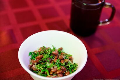 фасолевый салат с пассерованной морковью в томатном соусе и семенами подсолнечника,
