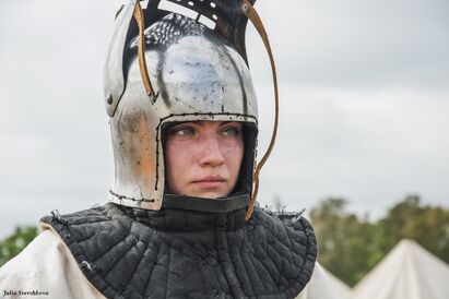 — Да как из строя выйдет. Если доспех хороший, то он прослужит долго. Именно поэтому я выступаю за то, чтобы не экономить на снаряжении — лучше заказать один раз и сразу хорошее, и тогда его не придётся в скором времени менять. Я бы и «ноги» не стала менять, они у меня очень хорошие, но титановые весят в два раза меньше, чем стальные — 4 килограмма вместо 8. Я хочу чтобы мои суставы и спина прослужили мне чуть подольше, так что руководствовалась этими соображениями. А так моё снаряжение очень хорошее, единственное, что шлем надо обновлять, мой больше для турнирных боёв, чем для массовых. Кто может себе позволить, заводит несколько комплектов — отдельный шлем для турнирных боёв, отдельный шлем для бугуртных номинаций. То же самое — отдельная лёгкая брига для турниров, утяжелённая для бугуртов. Всё равно снаряжение у нас ненамного дороже, чем в том же хоккее. В принципе в любом виде спорта профессиональное снаряжение требует серьёзных финансовых вливаний.