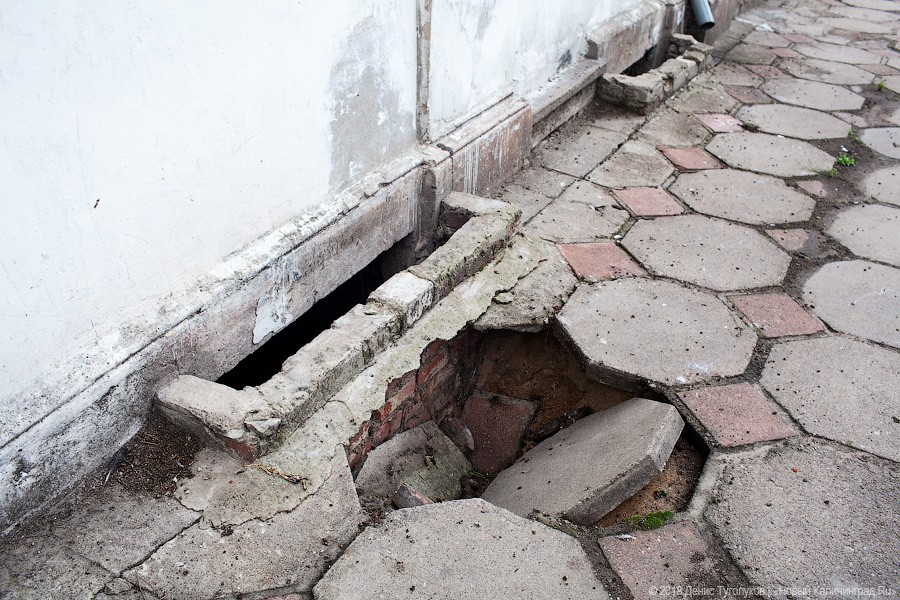 Есть у регулярных потопов и более серьезные последствия. Плитка на узкой пешеходной дорожке возле дома то и дело проваливается в разных местах, и под тротуаром начинают зиять глубокие ямы. Это, по убеждению местных жителей, следствие того, что грунт под домом подмывает река и само здание медленно сползает в реку.