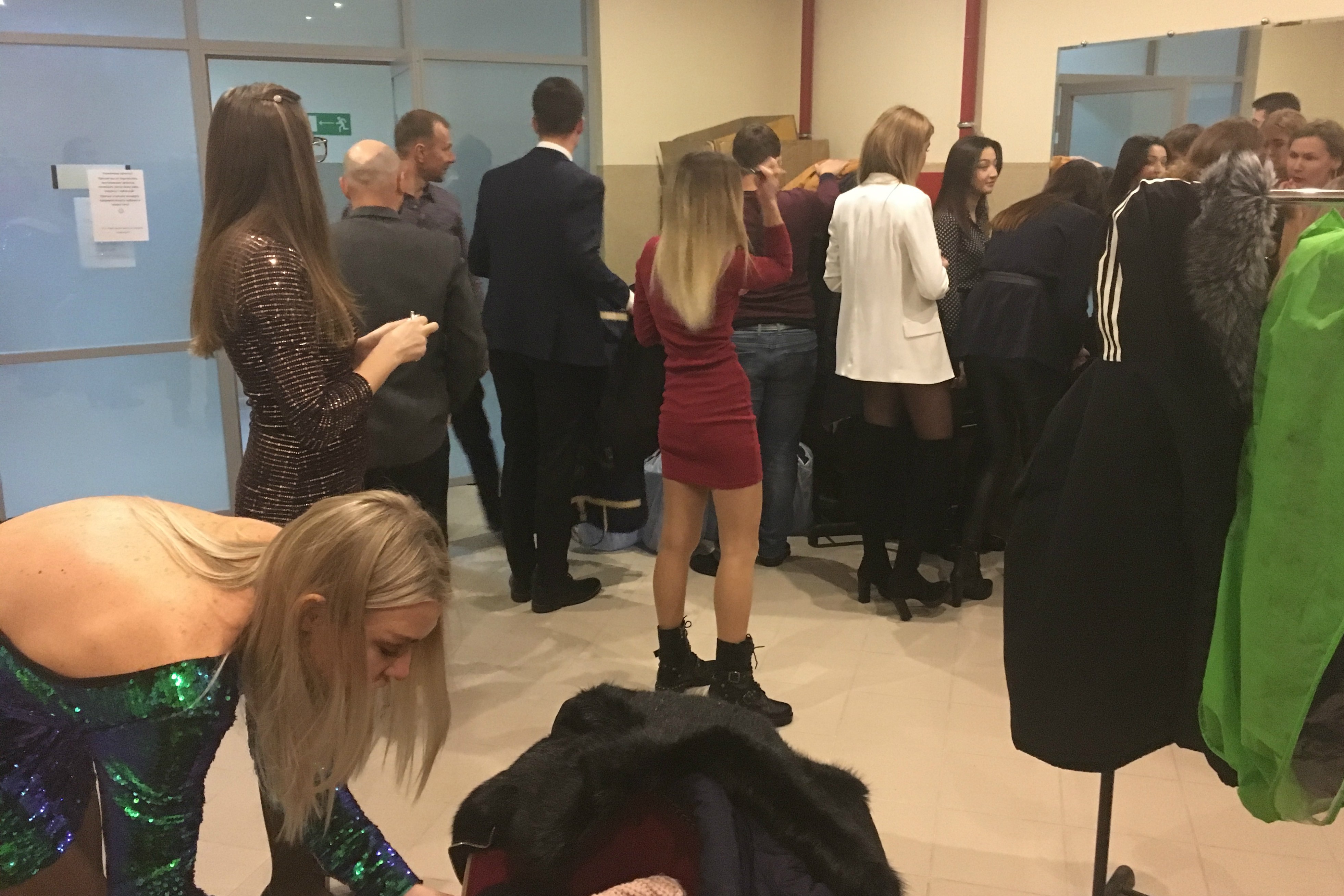 В гримерных есть пара вешалок, несколько стульев и большое зеркало на стене. Этого категорически не хватает на две сотни человек. Многим переодеваться приходится прямо посреди помещения или прислонившись к стене. Вещи складывают на пол, а босыми ногами встают на отвороты своих сапог или на полиэтиленовый пакет. У зеркала давка: девушки в спешке красят губы, закалывают волосы, поправляют бюстгальтеры и колготки.