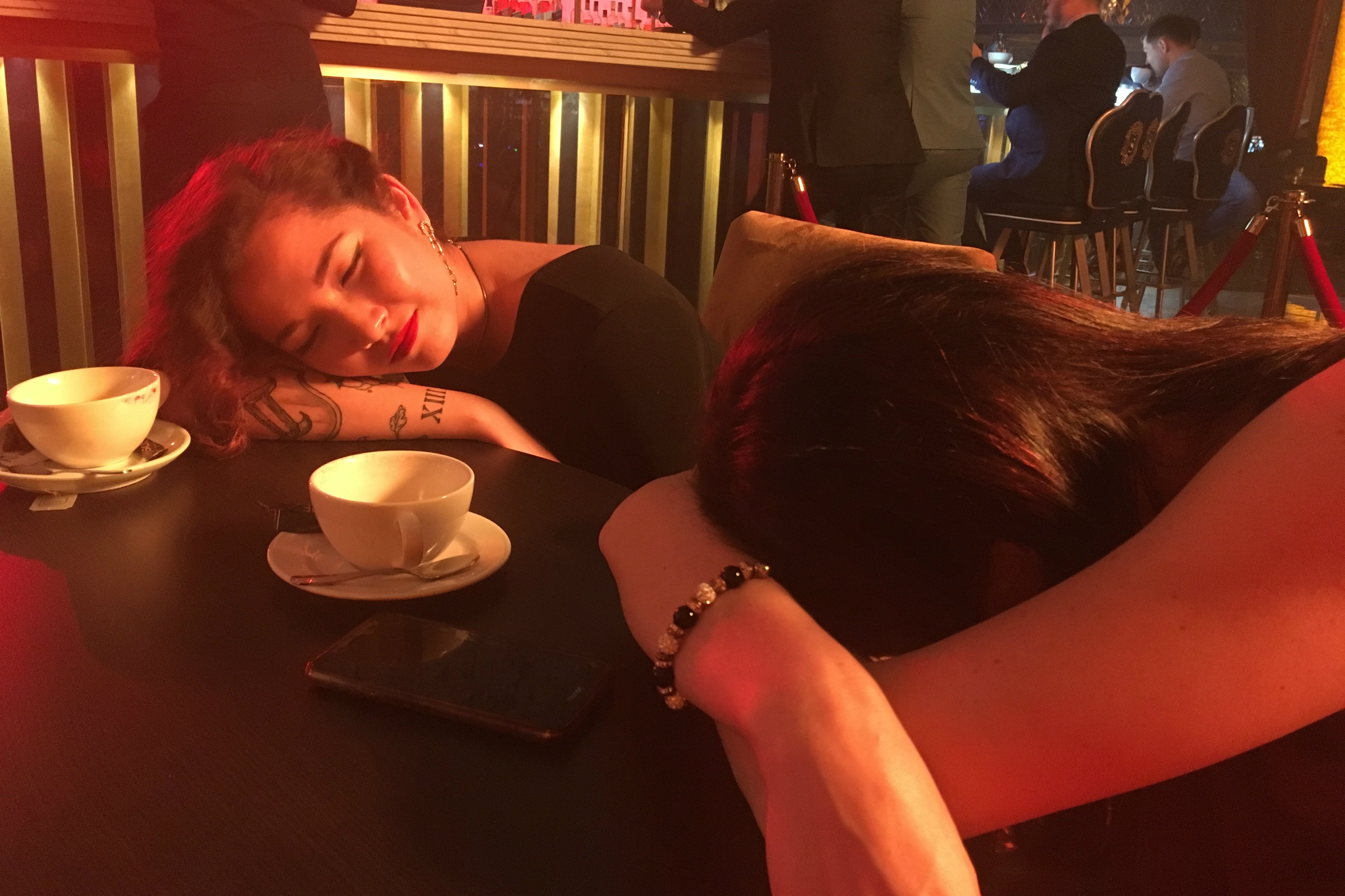 «Я, наверное, сдохну здесь! По два часа сплю. У меня в казино уже четвертые съемки, а вообще в проекте — шестые, — с улыбкой капризно закатывает глаза к потолку девушка в очках и в длинном кардигане. Несмотря на жалобы, видно, что ей происходящее скорее нравится: девушка с явным удовольствием рассказывает, как вчера ее с подружками отправили на несколько часов на улицу — изображать посетительниц, выходящих из казино.