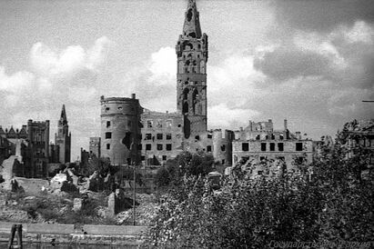 Каким было преобладающее общественное мнение в первые десятилетия после войны по поводу немецкой архитектуры, понять довольно сложно — социологических опросов тогда не проводилось. Поэтому власти брали инициативу на себя: Королевский замок начали уничтожать практически сразу. Здание значительно пострадало во время войны, но основной ущерб ему нанесли уже в гражданское время. Военные загнали на территорию замка спецтехнику и начали разбивать стены. Рядом стояла дробильная установка, которая перерабатывала замковый кирпич в щебенку.