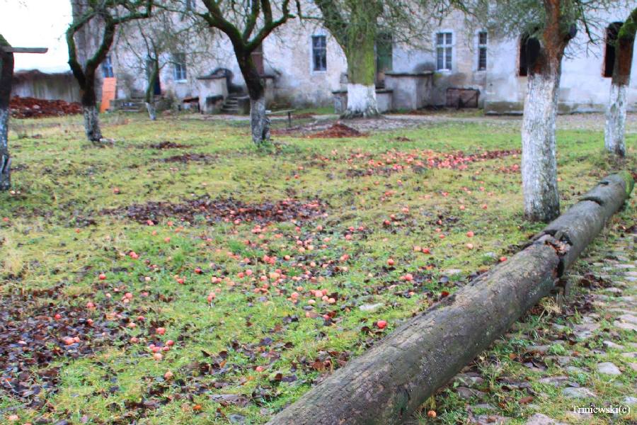 Краевед Николай Троневский опубликовал в Facebook* фото, сделанное осенью 2017 года. На нём видно, что яблок в саду действительно было очень много, хотя и сложно сказать, с каких именно деревьев они нападали. По его словам, во дворе замка была «тьма яблок», и они были очень вкусные.