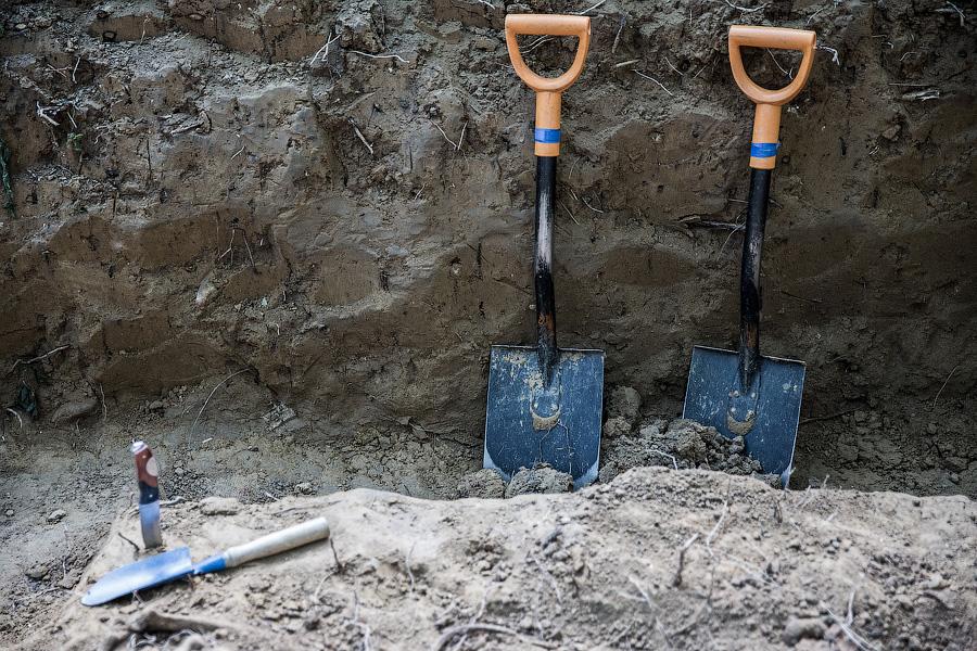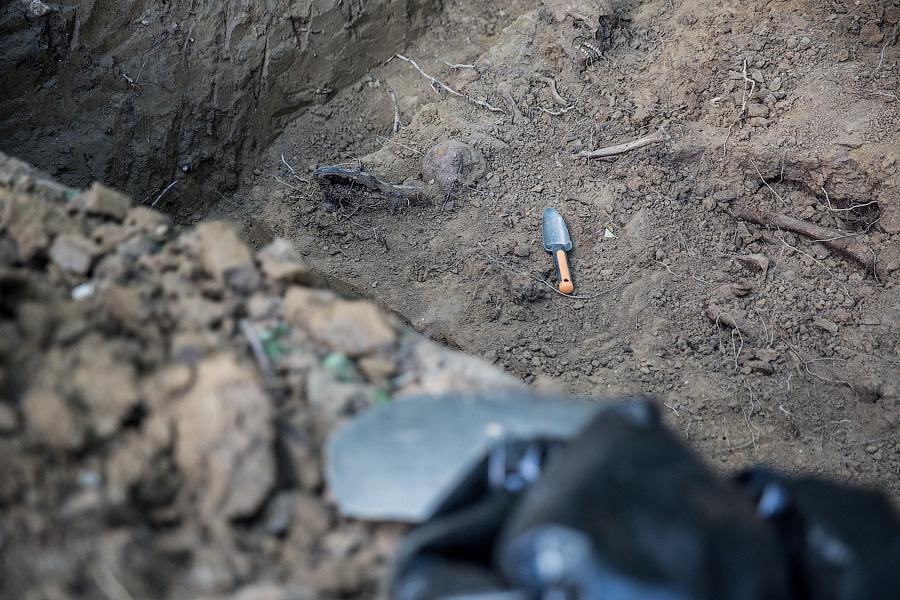 Кто-то идет по территории с прибором, а кто-то в это же время рядом протыкает землю «щупом». Параллельно «бьются шурфы» — делаются вертикальные выемки грунта. «У нас это называют „принюхаться к грунту“. Если в каком-то месте грунт смешанный, а не слоями, то там может быть либо братское захоронение, либо траншея. Если пустоты или очертания досок сгнивших видны, тогда можно предположить, что люди в гробах лежали», — рассказывает Андрей. Если появляется подозрение на то, что в грунте что-то есть, то яму постепенно расширяют, а кости аккуратно расчищают кисточками — поисковики называют это «проводить археологию». Весь процесс эксгумации обязательно фиксируется на фото. В обязательном протоколе эксгумации указывается не только дата обнаружения и местоположение останков, но количество и размер костей, какие ранения удалось на них распознать, какие личные вещи обнаружены рядом.