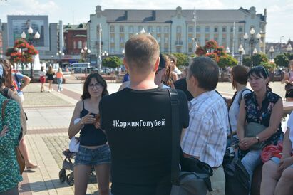 В Калининграде горожане несколько уикендов подряд выходили на площадь Победы, чтобы «покормить голубей» в поддержку Хабаровска. Люди просто собирались у Триумфальной колонны. Кто-то один мог достать плакат с лозунгом в поддержку хабаровчан, многие надевали футболки с тематическими принтами. Полицейские в мегафон требовали от калининградцев разойтись, потому что «акция незаконна». После этого как минимум на шестерых калининградцев, пришедших на площадь Победы 8 августа, полицейские составили протоколы по ч. 5 ст. 20.2 КоАП РФ за нарушение правил участия в публичном мероприятии. «Новый Калининград» записал монологи нескольких местных жителей, которым за прогулку в центре города теперь грозит суд и штраф в 10-20 тыс рублей.