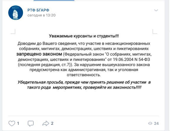 Аналогичное объявление появилось и в группе «РТФ БГАРФ» во «ВКонтакте», которая позиционируется как «сообщество курсантов и студентов радиотехнического факультета БГА». Однако в пресс-службе академии сообщили, что данная страница не является официальной и ее создали, по всей видимости, сами учащиеся. В ведомстве отметили, что никаких предупреждений относительно митингов по распоряжению руководства вуза не публиковалось и не озвучивалось.