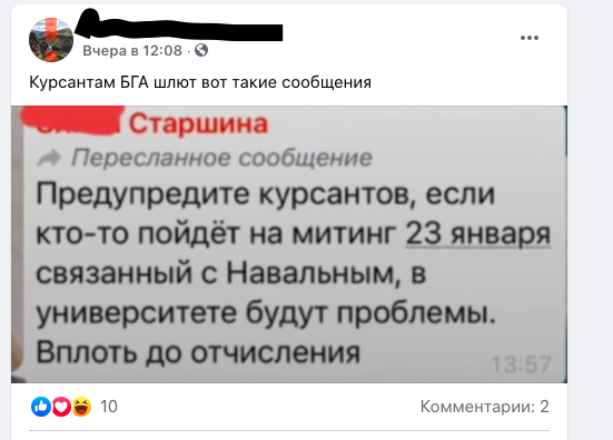 20 января в «Фейсбуке*» появился пост о том, что курсантов Балтийской государственной академии рыбопромыслового флота пугают отчислением, если они примут участие в несанкционированной акции. «Предупредите курсантов, если кто-то пойдет на митинг 23 января, связанный с Навальным, в университете будут проблемы. Вплоть до отчисления», — говорилось в сообщении, скрин которого был опубликован в соцсети. По данным источника «Нового Калининграда», такие сообщения в мессенджерах получили некоторые курсанты третьего курса БГА РФ от своего старшины.