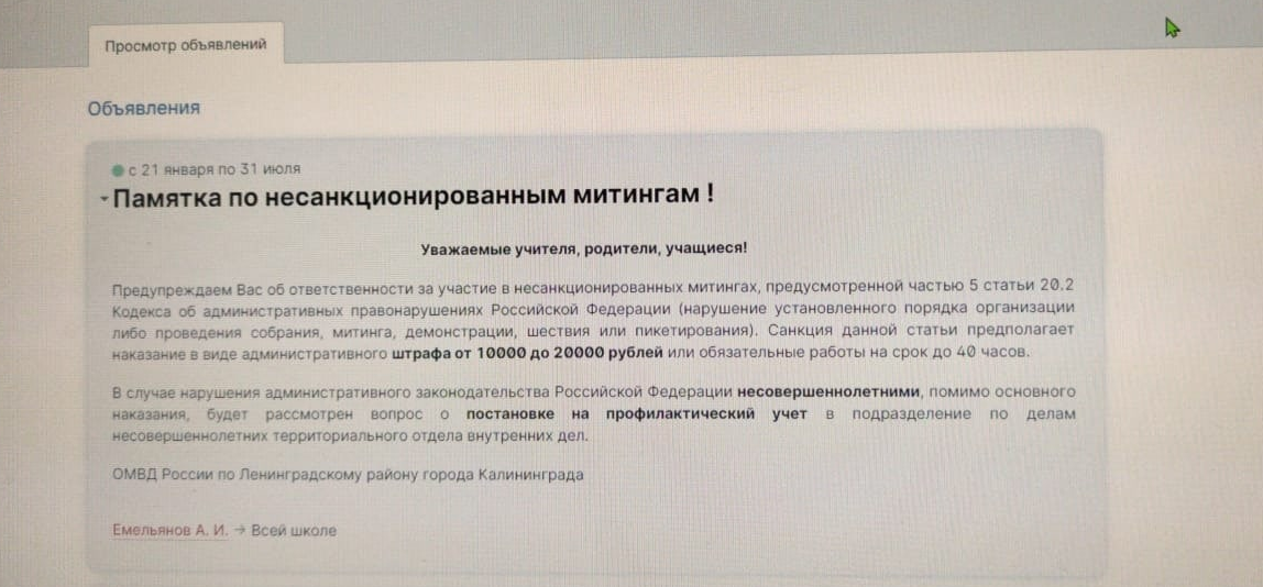Помимо учащихся вузов, сообщения с предупреждением о нежелательности участия в несогласованных акциях и ответственности за вовлечение в это несовершеннолетних получили и некоторые родители калининградских школьников. Так, например, в электронном дневнике учащихся школы № 25 появилась «памятка по несанкционированным митингам» от ОМВД России по Ленинградскому району: учителей, родителей и учащихся предупреждали о возможных штрафах и постановке на профилактический учет в ПДН. Аналогичное предупреждение получили, судя по публикации калининградки, и родители учеников школы № 2. В этом случае сотрудники школы отдельно еще и предупредили родителей, что в субботу дети должны явиться на внеплановый мониторинг и после него ученикам следует отправиться домой.