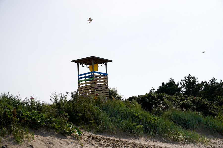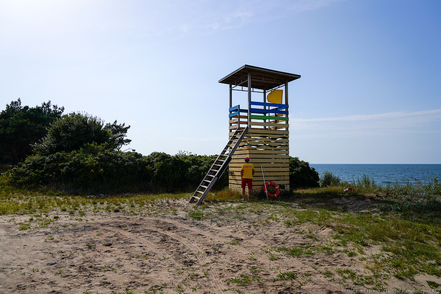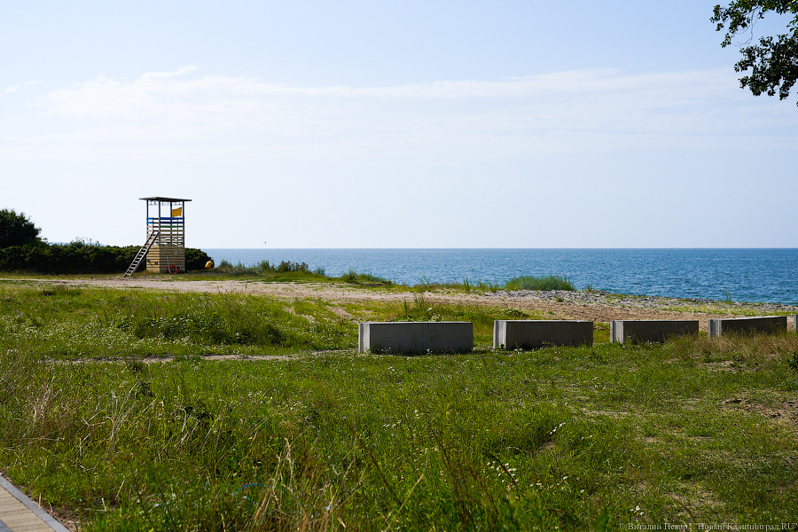 Вдоль велодорожки «от косы до косы», которая проходит через участок инвестора, с одной стороны установлено ограждение. Оно проходит через зону со спасательной вышкой, где можно спуститься на побережье (оборудованных спусков в этом месте сейчас нет). Для пляжного отдыха здесь предусмотрена территория протяжённостью 150 метров. Кабин для переодевания, о которых сообщали в администрации, на участке не наблюдается, однако на вышке, как и обещали чиновники, дежурят спасатели, а на деревянной конструкции висит несколько спасательных кругов.