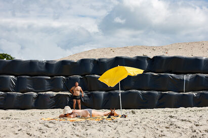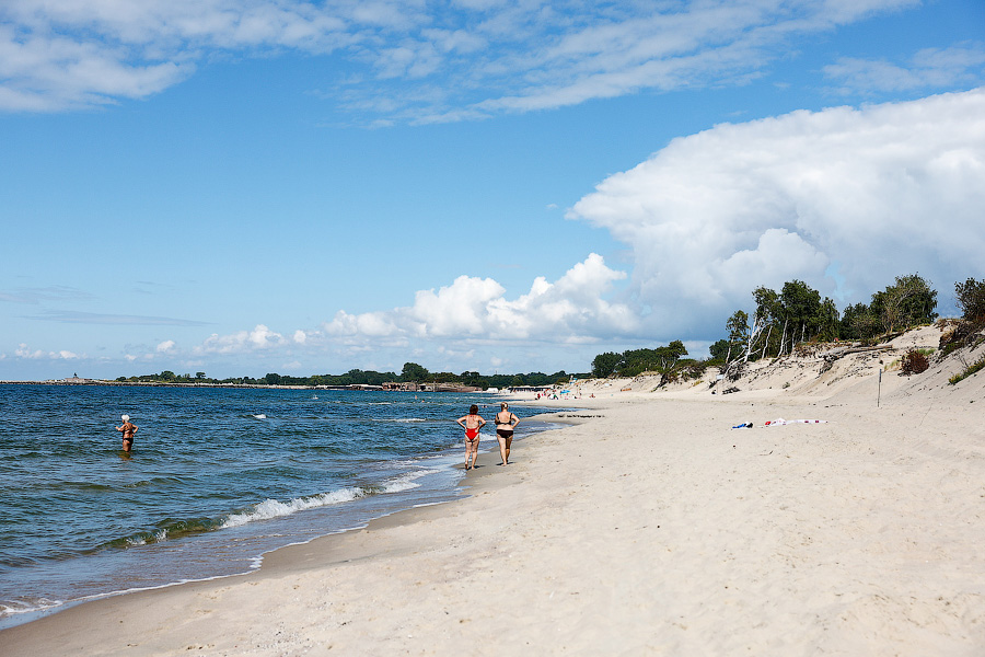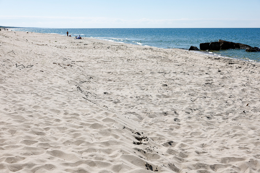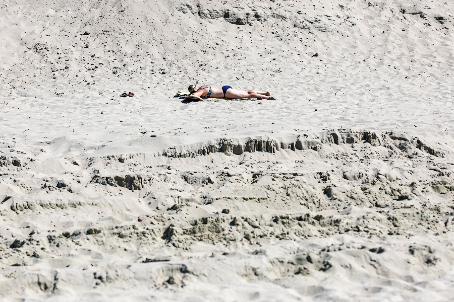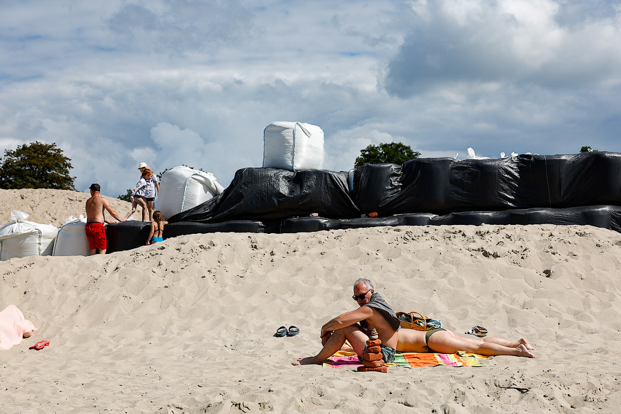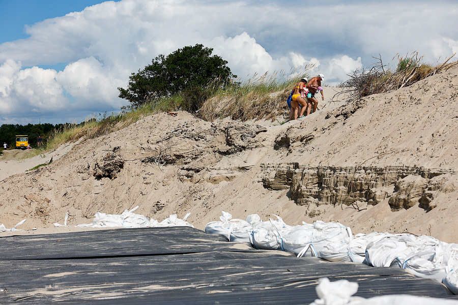 Официальный пляж на Балткосе этим летом обустроили впервые. Его разместили чуть дальше места берегоукрепительных работ, но отдыхающие есть и возле биг-бэгов: они карабкаются по ним через дюны, используют их в качестве лежаков, с интересом ковыряют полиэтилен и вообще активно взаимодействуют с новыми «запчастями» авандюны.