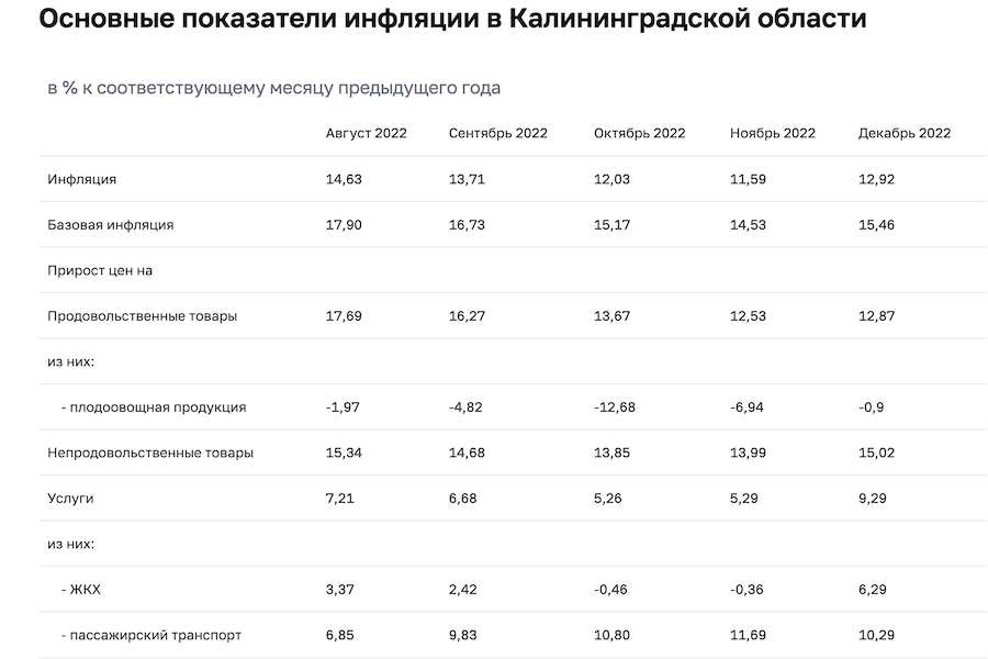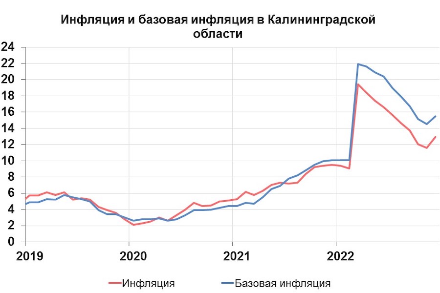 Инфляция в Калининградской области ускорилась и снова превысила и общероссийские показатели, и цифры по Северо-Западу. Об этом говорится в аналитической записке, опубликованной Центральным банком. Годовая инфляция в регионе в декабре 2022 года достигла 12,92% после 11,59% в ноябре. По Северо-Западному федеральному округу инфляция ниже — 11,90%, по России в целом — тоже (11,94%).