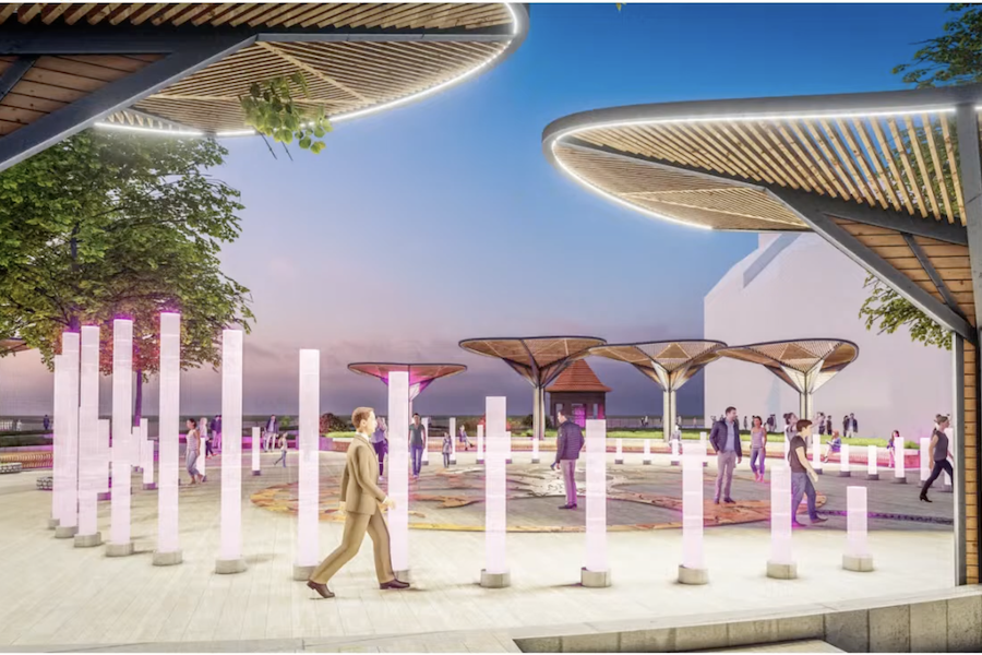 Для защиты от солнца на променаде хотят поставить перголы, напоминающие исполинские грибы (авторы концепции настаивают, что это «деревья»). Они же будут отвечать за освещение променада. «Наши перголы в виде деревьев являются также световыми навесами, под которыми можно укрыться в солнечную жаркую погоду и покачаться на качелях, которые также интегрированы в эту форму. <...> В зимний период мы их будем украшать гирляндами», — продолжил архитектор.
