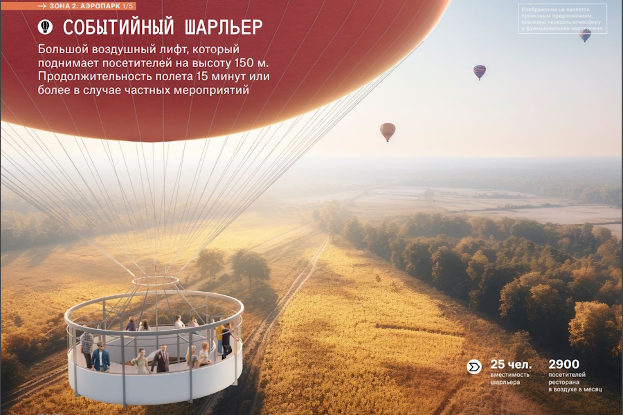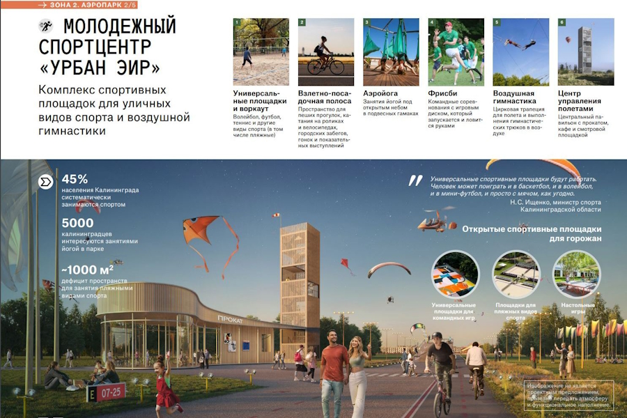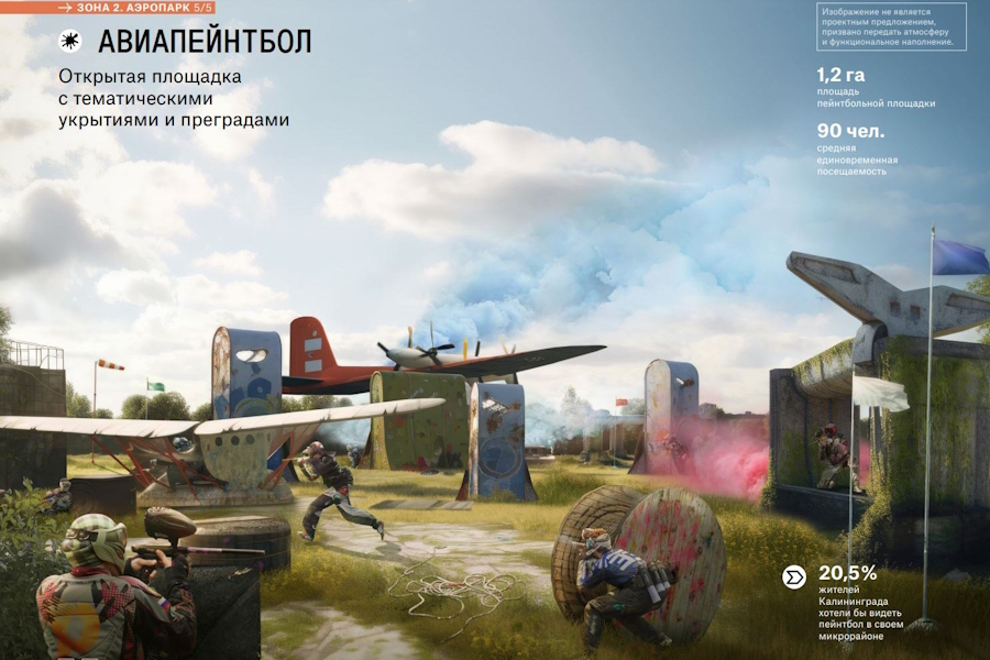 Взлётно-посадочная полоса должна стать центральной аллеей с аэропарком «Взлётка» в конце, где выделили место для мотопарапланов, автожиров и тестирования авиамоделей. Также здесь предлагается оборудовать гоночную трассу для дронов и тематическую площадку для пейнтбола.