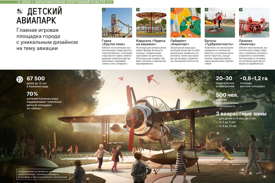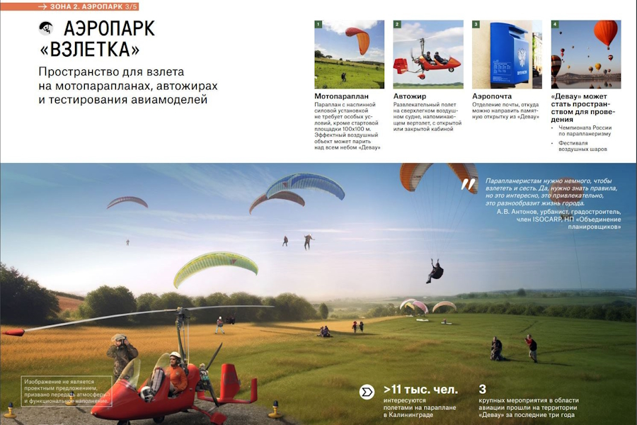 «Совсем недавно прошли публичные обсуждения Генерального плана, и администрация города Калининграда внесла предложение в том числе по развитию территории вокруг бывшего аэродрома Девау, — рассказал первый замглавы администрации города Игорь Шлыков. — Это касается проектирования улиц Денисова, Благовещенской и территории, прилегающей к аэродрому. Во всех этих местах мы хотим доделать магистраль — там четырехполосная магистраль будет. Нам нужно создать транспортный узел, который позволит посетителям нового парка запарковать свои автомобили. Также мы туда планируем запустить общественный транспорт. Под все это нужно создать дорожно-транспортную инфраструктуру».