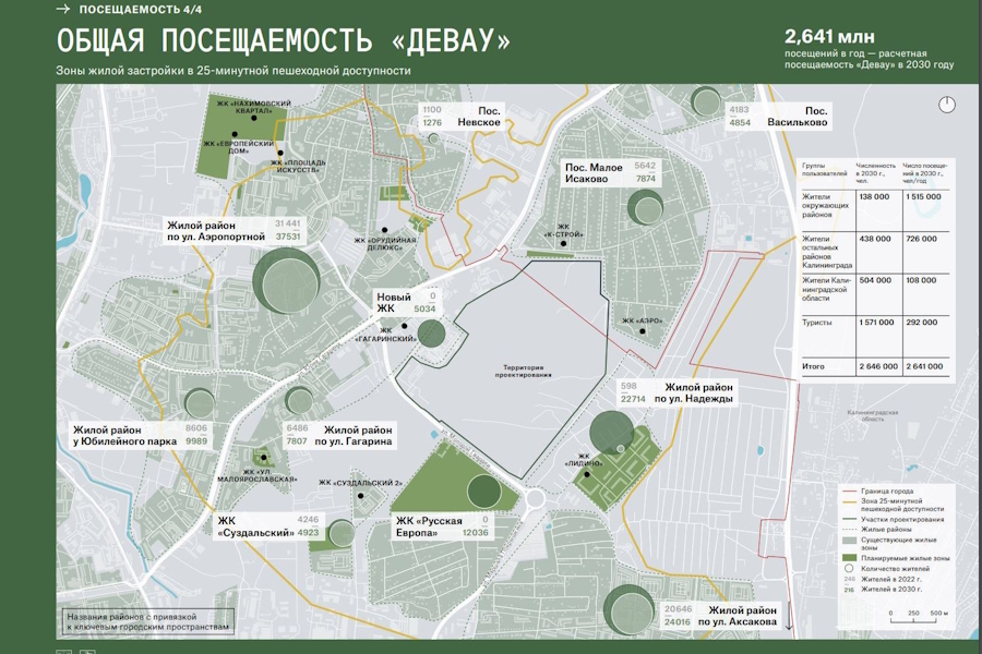 По данным авторов «преконцепта», к 2030-му посещаемость парка должна составить 2,641 млн человек в год. При этом более 1,5 млн из них — это жители окружающих районов, в том числе активно строящихся многоэтажек практически на границе будущего парка.