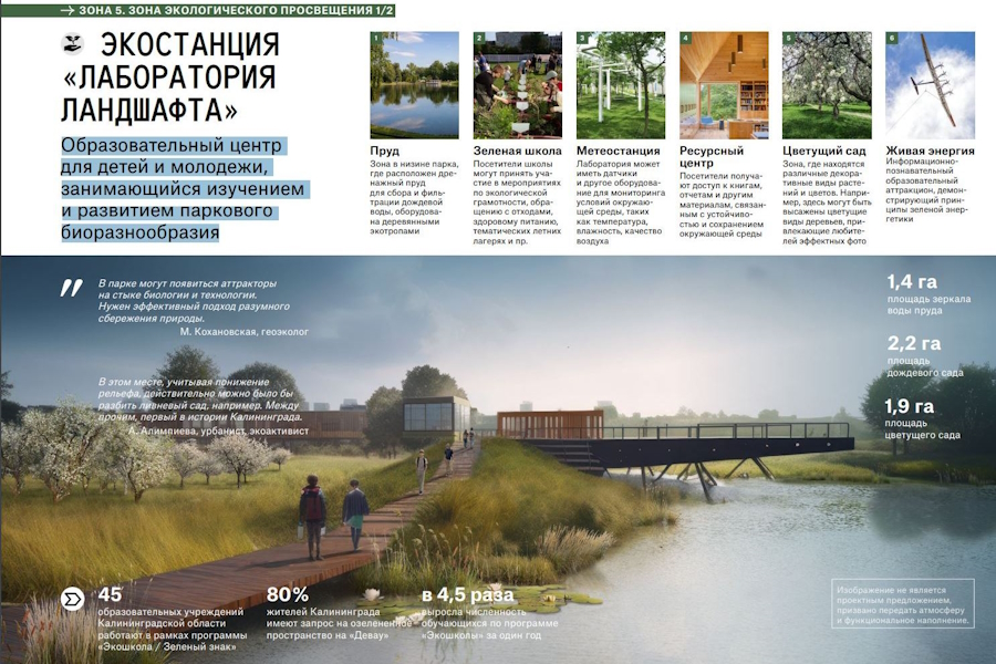 К востоку от взлётно-посадочной полосы разместили зону экологического просвещения. По словам Семериковой, это будет самая насыщенная различными типами ландшафта часть парка. Как указано в презентации, это будет «образовательный центр для детей и молодежи, занимающийся изучением и развитием паркового биоразнообразия».