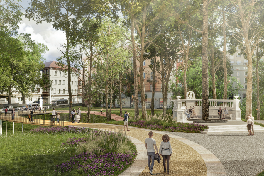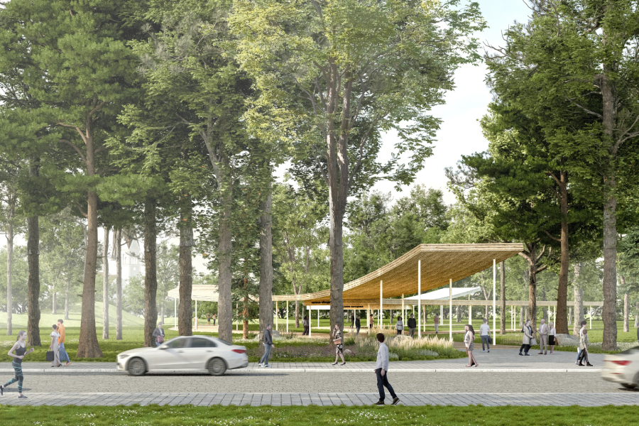 При этом авторы концепции утверждают, что здоровые деревья, в которые в некоторых местах, вполне возможно, уткнутся пешеходные дорожки или другое благоустройство, будут «интегрированы» в дорожное покрытие и не пострадают.