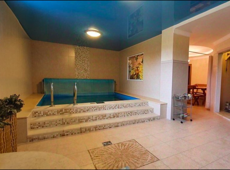 На территории есть крытый бассейн, баня, зона барбекю, гараж на 2 машины и паркинг еще на 2 машины, красивый кованый забор и благоустроенный двор.
