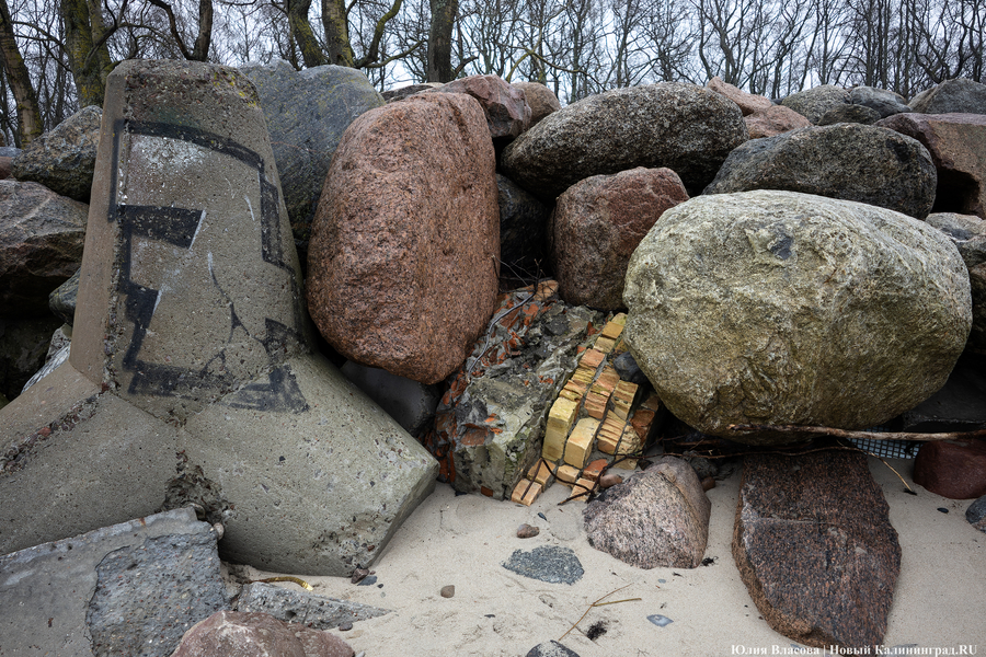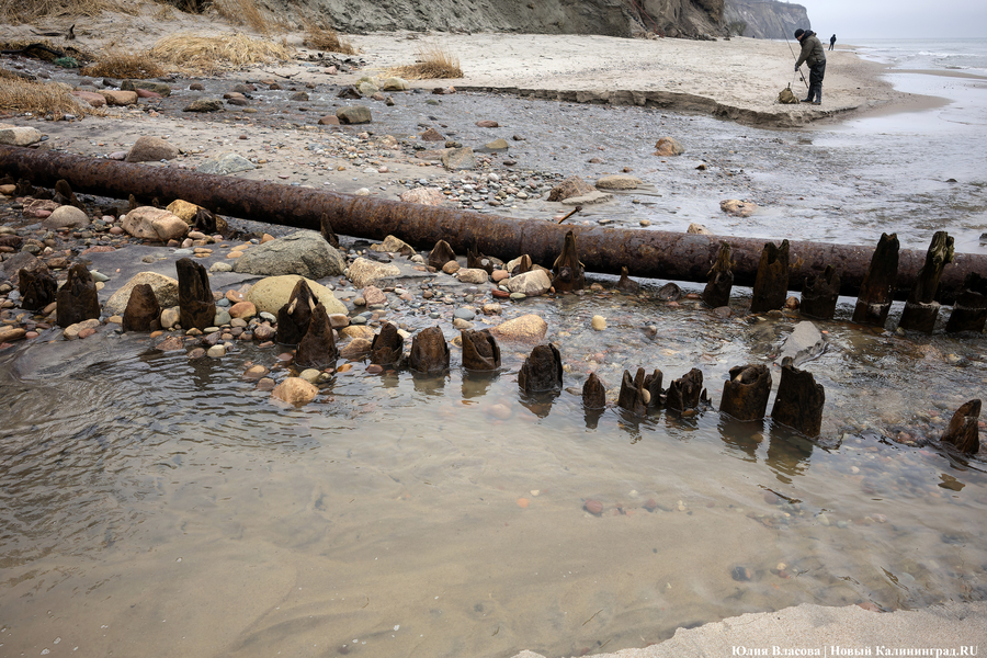 Жители Восточной Пруссии для берегозащиты использовали буны (волнорезы) — ряды свай из прочных пород дерева, между которых часто насыпали валуны. Со временем эти конструкции разрушились, что не замедлило сказаться на состоянии пляжей. Даже в районе Донского, где на это прежде никто особо не жаловался, полоска песка между водой и высоким берегом местами стала угрожающе тонкой. Вдоль береговой стены громоздятся совсем свежие обвалы: она буквально измочалена штормом на всем протяжении. Но в этот день море насмешливо тихое, и волны ласково плещутся у остатков единственного волнореза, гнилые зубы которого не способны испугать уже никого и ничего.