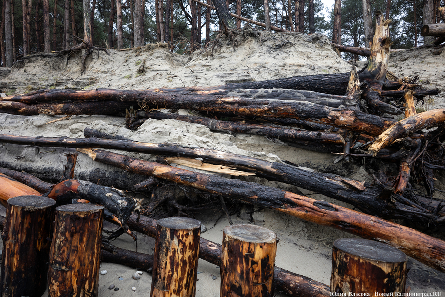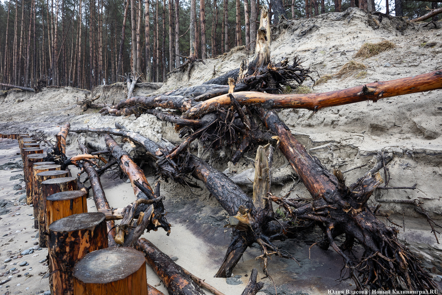 Хуже всего дела обстоят в Куликово. Несмотря на героические усилия «Балтберегозащиты» (а, возможно, и благодаря им), привыкшие здесь бесноваться туристы-«дикари» доступа к воде, похоже, пока будут лишены совсем. Вдоль всего соснового лесочка, который летом превращается в один большой то ли лагерь, то ли туалет, идут берегозащитные работы. Параллельно кромке воды на протяжении нескольких километров вбиты сваи, между ними и берегом наваливаются столь любимые калининградскими «укрепителями» биг-бэги с песком, с таким треском дискредитировавшие себя на Балтийской косе. Впрочем, здесь для верности их засыпают валунами. Пляж в Куликово исчез в принципе, добравшиеся сюда редкие аборигены с удивлением рассматривают свайный частокол, преграждающий путь к воде. Охраняющий строительную технику мужчина рассказывает нам, что все это по осени было засыпано песком, сейчас благополучно смытым. Судя по следам на берегу, сваи для моря не стали преградой — и по краям то здесь, то там, за жизнь корнями цепляются свежеповаленные сосны.