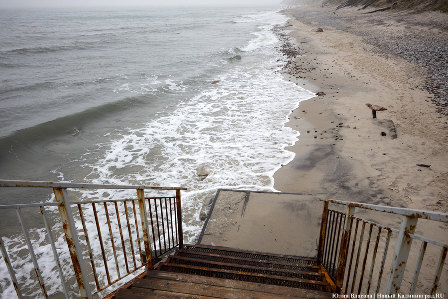 Песчаному пляжу в Пионерском повезло, поскольку его защищает портовый мол. Ближе к госрезиденции его «охрана» уже практически не заметна, а у Заостровья исчезает совсем. Но и пляж здесь такой ширины, что, даже сократившись раза в два, выглядит относительно просторным. О штормах напоминают принесенные ими кучи булыжника, поваленные сосны и многострадальная лестница, у которой в очередной раз снесло нижние ступени.