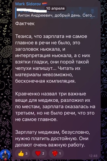 «Читать их материалы невозможно, бесконечная компиляция, — написал бывший сотрудник министерства. — Кравченко назвал три важные вещи для медиков, разложил их по местам, зарплата оказалась на третьем, но не было речи, что это не самое главное. Зарплату медикам, безусловно, нужно платить достойную. Они делают очень важную работу».