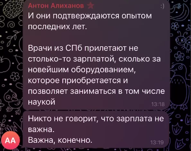 «И они подтверждаются опытом последних лет. Врачи из СПб прилетают не столько-то зарплатой, сколько за новейшим оборудованием, которое приобретается и позволяет заниматься в том числе наукой. Никто не говорит, что зарплата не важна. Важна, конечно», — заключил губернатор.