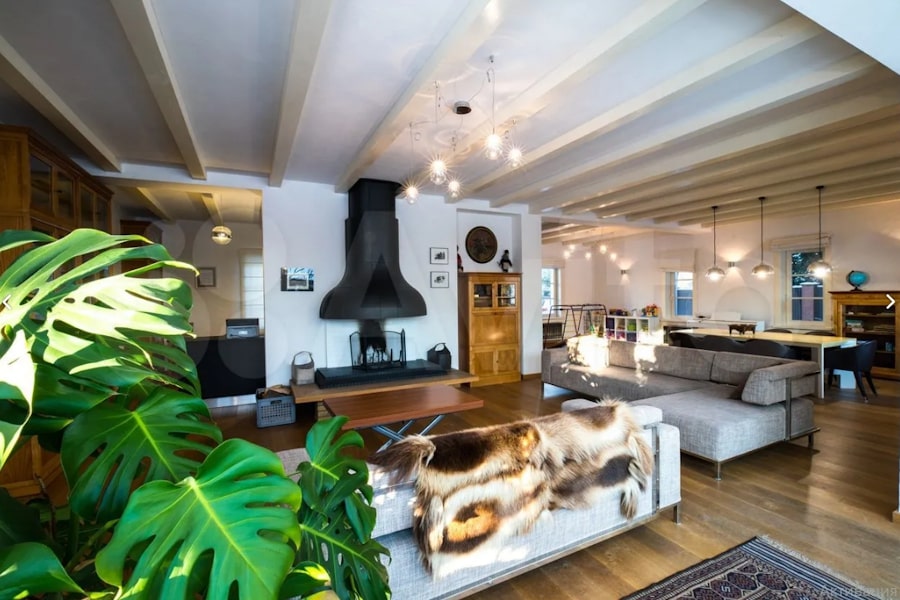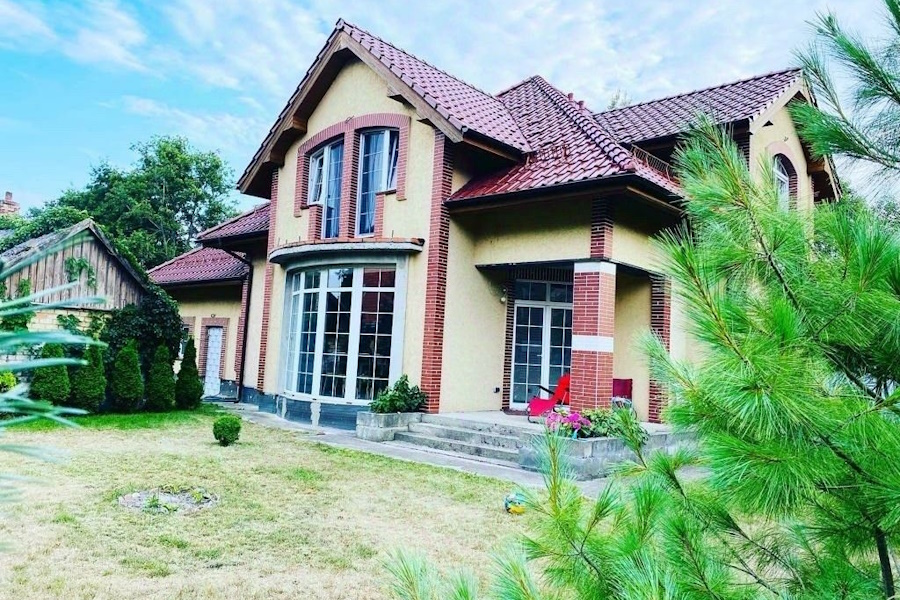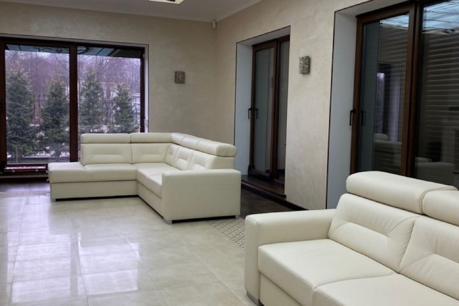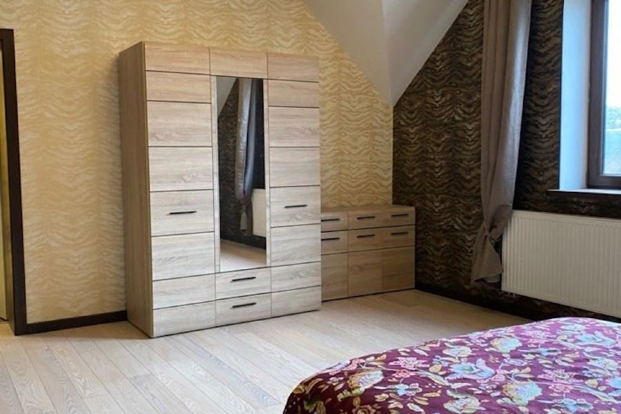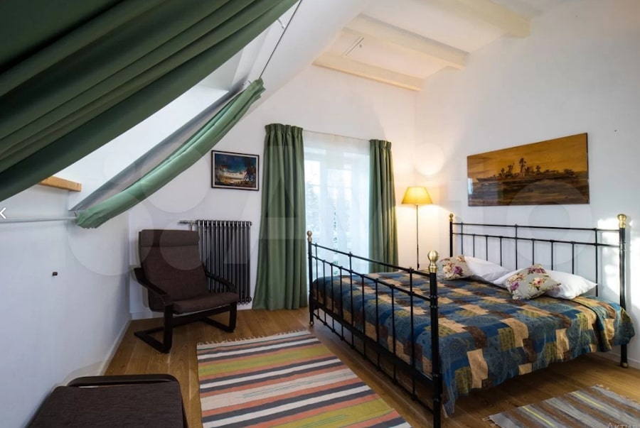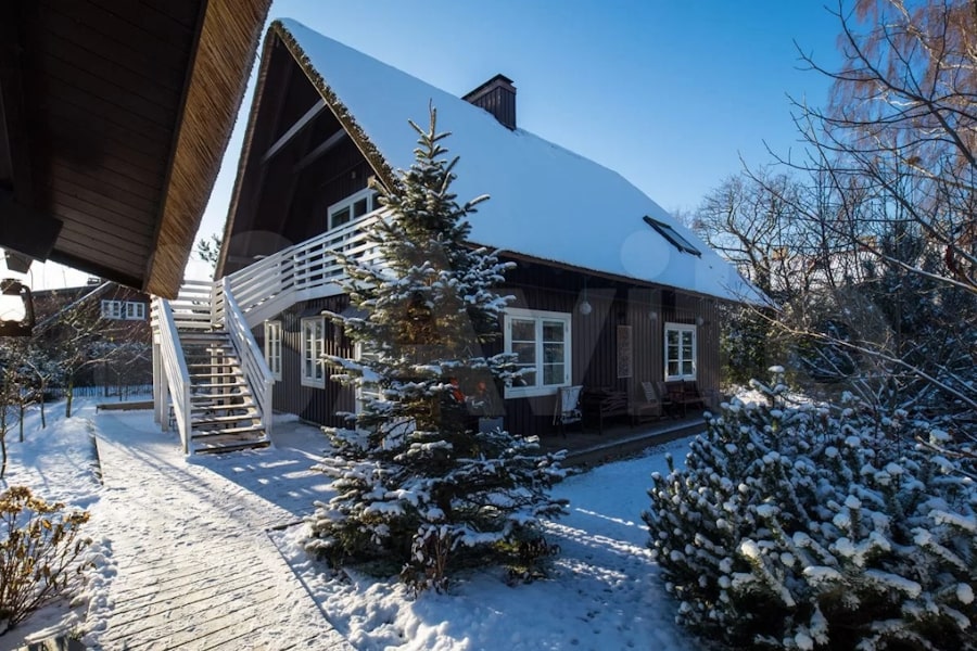 «Резиденция „Сказочная Дача“ — это комплекс функциональных строений: жилой дом — 256,7 кв. м.; гостевой дом — 147,1 кв. м.; хозяйственный дом с кухней-столовой, верандой, мастерской, баней — 184,8 кв. м, — говорится в объявлении. — Два этажа, пять спален с санузлами, полы из натуральной дубовой доски, в санузлах полы из лиственницы. Гостиная — студия с французским открытым камином и небольшой итальянской кухней. Главная спальня с финским камином из натурального камня. Итальянская мебель и светильники» (здесь и далее орфография и пунктуация сохранены — прим. «Нового Калининграда»).
