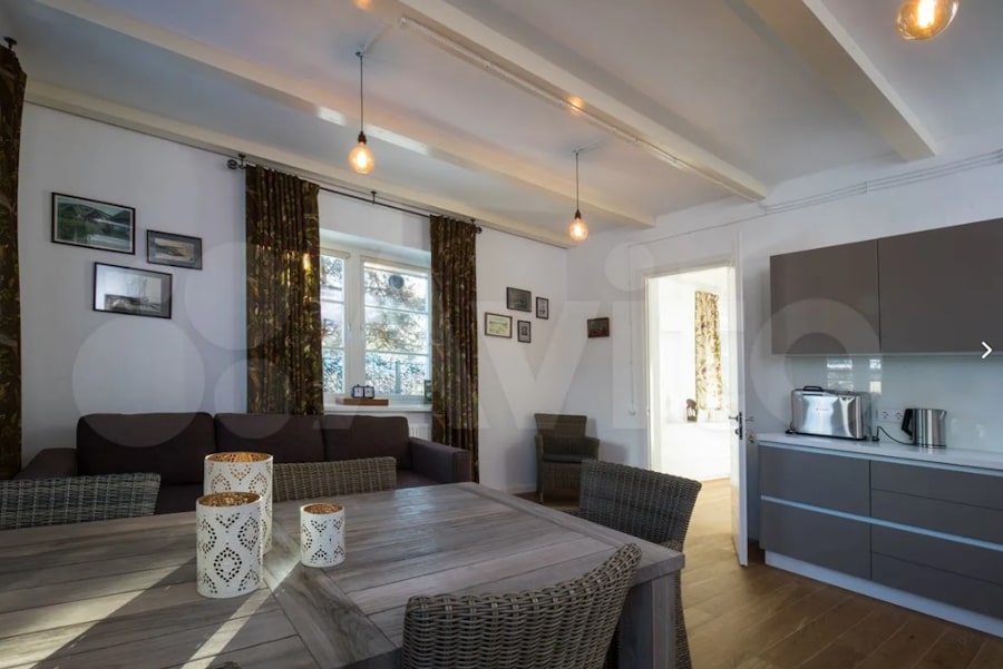 «Рядом дюна и залив, шикарный пляж, хвойный лес, — утверждают продавцы. — Два отдельных входа, уютная терраса, гараж. На первом этаже большая кухня и гостиная, на втором четыре спальни. Вдоль ограждений высажены деревья, забор. <...> 40 км от Зеленоградска, 4 км от границы с Литвой».
