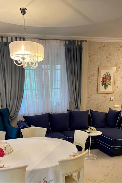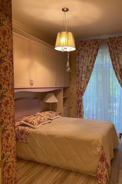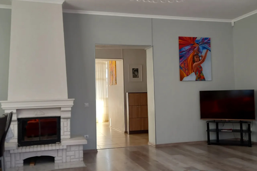Двухэтажный дом площадью 200 м² расположен в переулке Горького и рассчитан максимум на 12 гостей. В их распоряжении будут пять спален с шестью кроватями, кухня-гостиная, три санузла, библиотека и камин. На территории есть патио-барбекю, стол для настольного тенниса, вечерняя подсветка, диван-качель, солнцезащитный зонт, веранда с плетеной мебелью и крытая парковка на две машины. По запросу предоставляются самокаты.