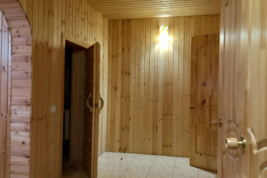Двухэтажный дом площадью 130 м² расположен на ул. Сосновой и вмещает до шести гостей (сдаётся часть дома с отдельным входом). Для гостей предусмотрены три спальни с тремя кроватями, гостиная с обеденной зоной, кухня с барной стойкой и два санузла. На территории находятся бассейн, банный комплекс и шезлонги.