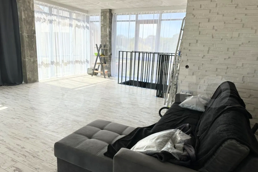 Двухэтажный дом площадью 200 м² находится на ул. Берёзовой и вмещает до десяти гостей. Для них предусмотрены пять спален, одна из которых детская, гостиная и два санузла. На территории есть баня (ей можно воспользоваться за дополнительную плату) и бассейн. Автор объявления описывает локацию как «тихое, спокойное место для семейного отдыха». От моря дом отделяют два километра, однако хозяева обещают вид на залив.