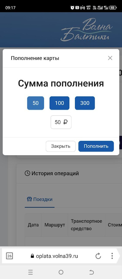 Спустя еще два дня, в четверг, 13 марта, корреспондент «Нового Калининграда» попыталась пополнить баланс своей транспортной карты прямо в автобусе. Но ссылка на оплату не заработала. Вместо нужного сайта появлялось просто белое поле с названием oplata.volna39.ru. Не помогло и посещение сайта «Волна Балтики» и поиск там ссылки на оплату. Появился тот же белый экран. Так что в автобусе пришлось платить банковской картой — 33 рубля, а не 28, как вышло бы с транспортной картой.